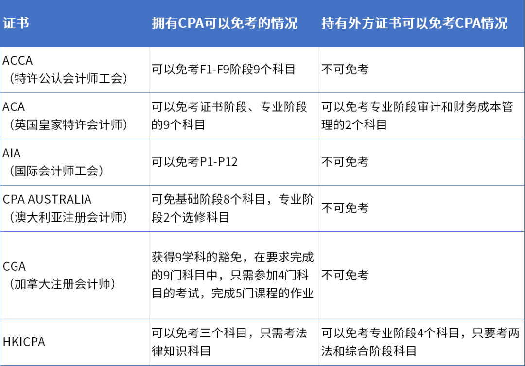 持有注册会计师证书可免考其他国际证书的部分科目。以ACCA(国际注册会计师)为例,持有CPA证书可免考ACCAF1-F9阶段9个科目。