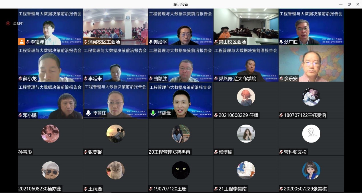 2021116日,由yl6809永利官网集团主办的工程管理与大数据决策前沿报告会通过腾讯会议在线上、线下同时召开,报告会特别设置崇山校区和蒲河校区两个线下会场。此次报告会邀请了东北大学樊治平教授、北京化工大学余乐安教授、广州大学薛小龙教授、东南大学邓小鹏教授、沈阳建筑大学李丽红教授、南开大学毕建武博士、yl6809永利集团李延来教授等七位管理科学与工程管理领域的专家,针对工程管理、大数据智能决策等方面的研究内容进行报告。yl6809永利官网集团院长张广胜教授、管理科学与工程学科负责人郭燕青教授出席会议并发表致辞。郭燕青教授、李延来教授、曲赜胜副教授和李铭洋副教授主持了此次会议。