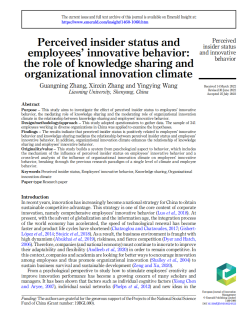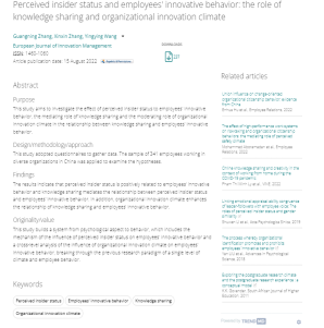 yl6809永利官网集团张广宁教授作为第一作者与硕士研究生合作完成的论文“Perceived insider status and employees’ innovative behavior: the role of knowledge sharing and organizational innovation climate”在《European Journal of Innovation Management》发表。