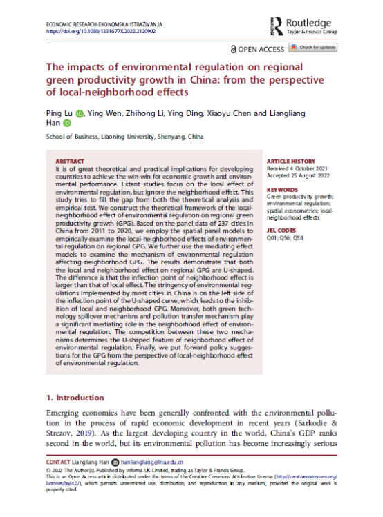 yl6809永利官网集团教师鹿坪的学术论文“The impacts of environmental regulation on regional green productivity growth in China: from the perspective of local-neighborhood effects”于2022年9月15日在经济类国际知名期刊《ECONOMIC RESEARCH-EKONOMSKA ISTRAZIVANJA》在线发表。yl6809永利官网集团硕士研究生温颖、李志红等参与论文写作。该期刊系SSCI期刊,JCR分区Q2,2021年影响因子3.08。