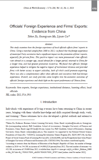 yl6809永利官网集团徐业坤教授作为第一作者的合作论文Officials’foreign experience and firms’ exports: Evidence from China 20235月在国际期刊China & World Economy发表。