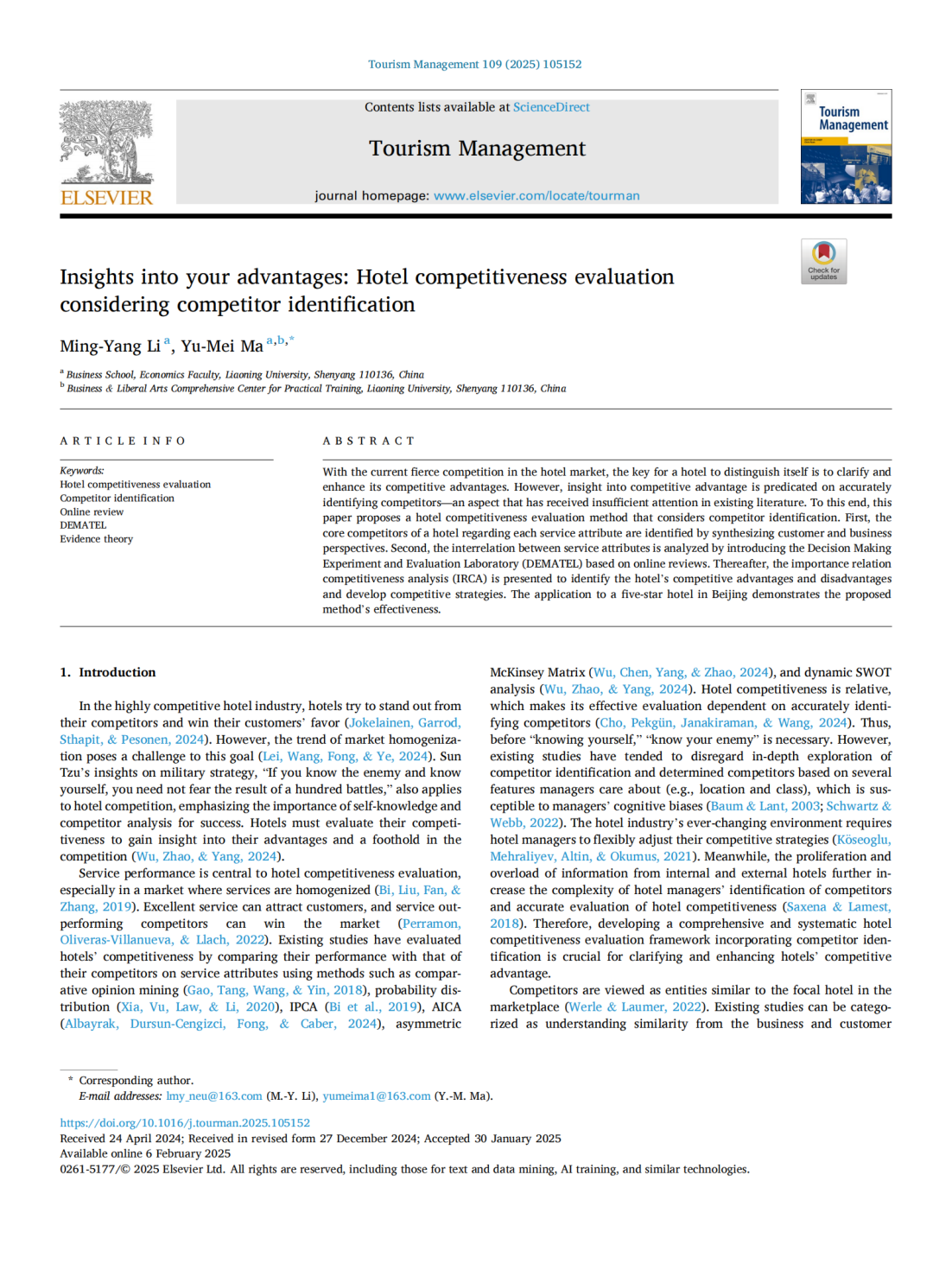 近日,yl6809永利官网集团李铭洋教授与马玉梅博士的合作论文Insights into your advantages:Hotel competitiveness evaluation considering competitor identification在旅游管理领域国际顶级期刊Tourism Management在线发表。
