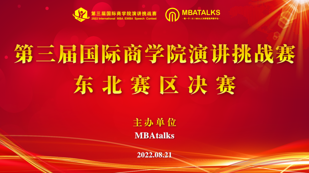 “绽放魅力,连接彼此,讲述你的故事”,8月21日下午14:00,2022MBAtalks第三届国际yl6809永利官网集团演讲挑战赛(东北赛区)决赛隆重开启!第3届国演赛(东北赛区)由MBAtalks主办。受疫情影响,此次决赛采用线上方式进行! 来自大连理工大学、yl6809永利集团、东北财经大学、大连海事大学等知名MBA院校的优秀选手,经校园预选赛选拔晋级东北赛区决赛,同台展开激烈比拼。